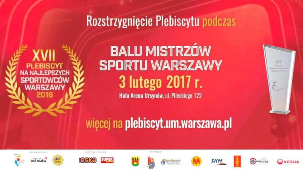 Uroczyste ogłoszenie wyników oraz wręczenie nagród XVII Plebiscytu na Najlepszych Sportowców Warszawy 2016 roku odbędzie się 3 lutego 2017 r., tradycyjnie podczas Balu Mistrzów Sportu Warszawy w hali widowiskowo-sportowej „ARENA URSYNÓW” przy ul. Pileckiego 122.